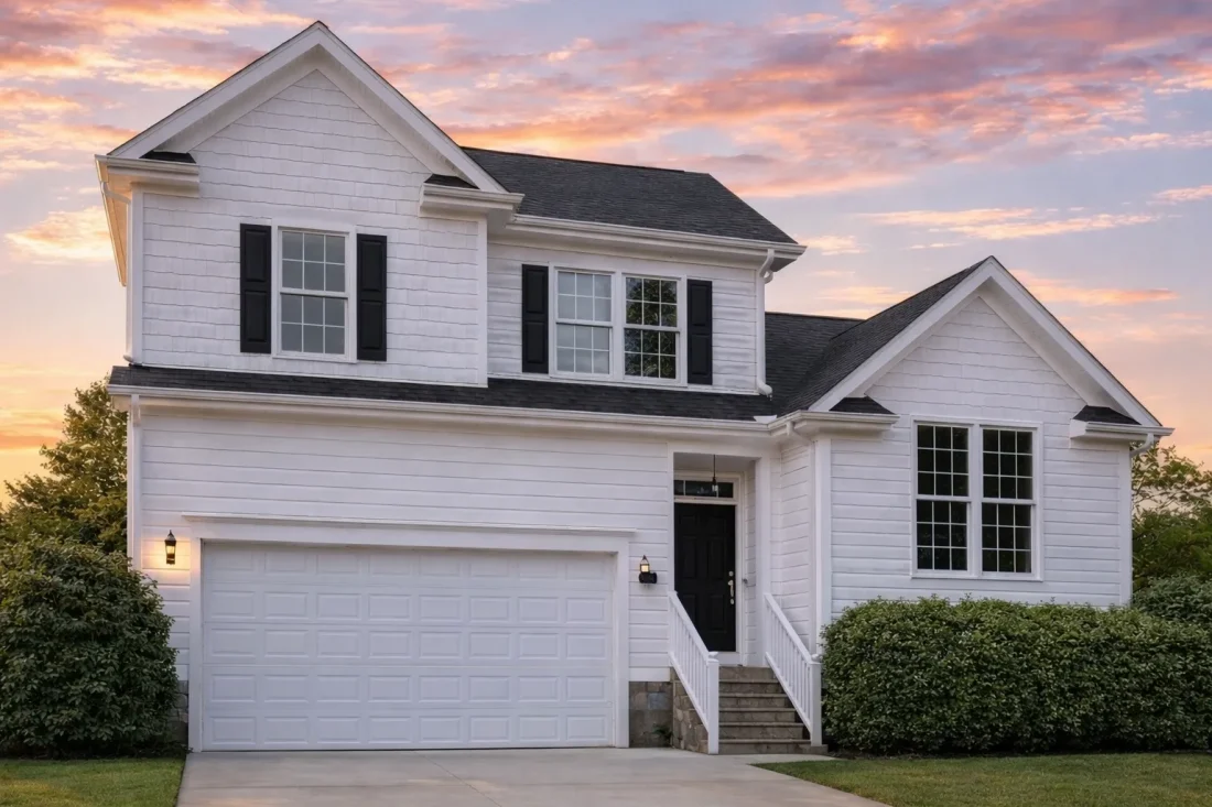 Horizontal lap siding provides durability, low maintenance, and visual simplicity. The smooth siding lines emphasize the home’s width and give it a polished suburban appearance. The understated trim and shutters reinforce its Traditional roots without overwhelming the façade.