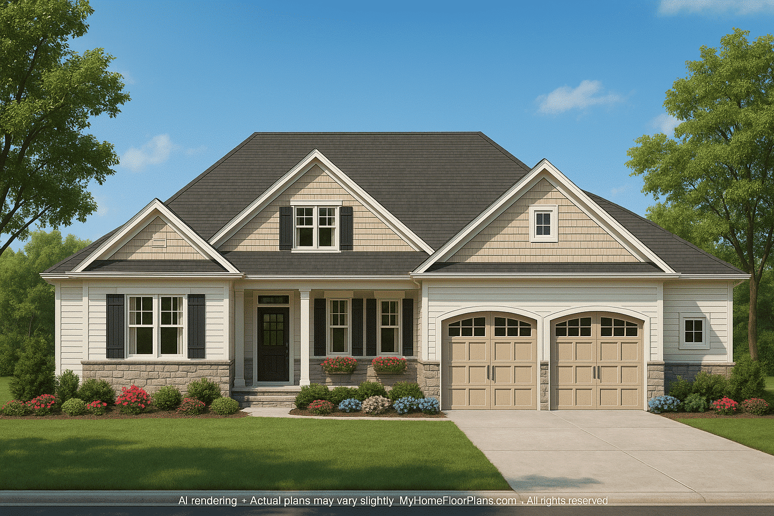 - Exterior features like shake siding and stone for Craftsman curb appeal.