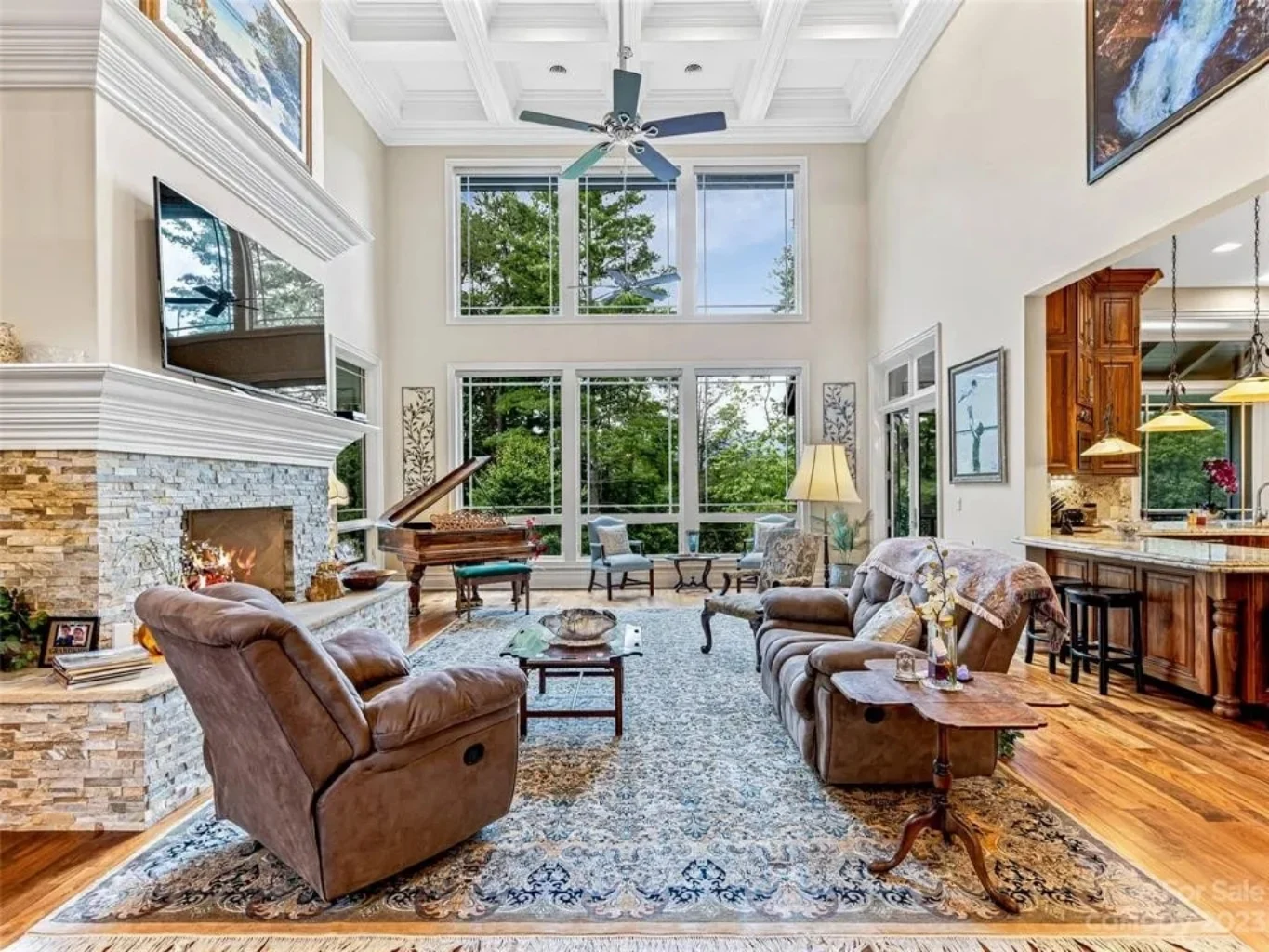- Vaulted ceilings and expansive windows framing mountain or forest views.