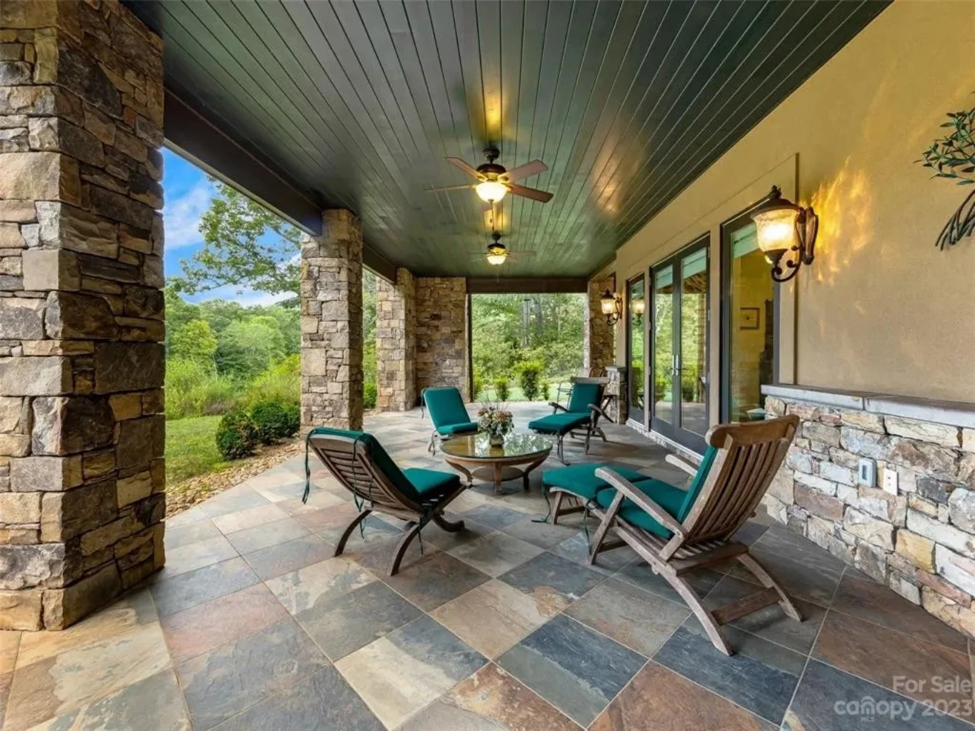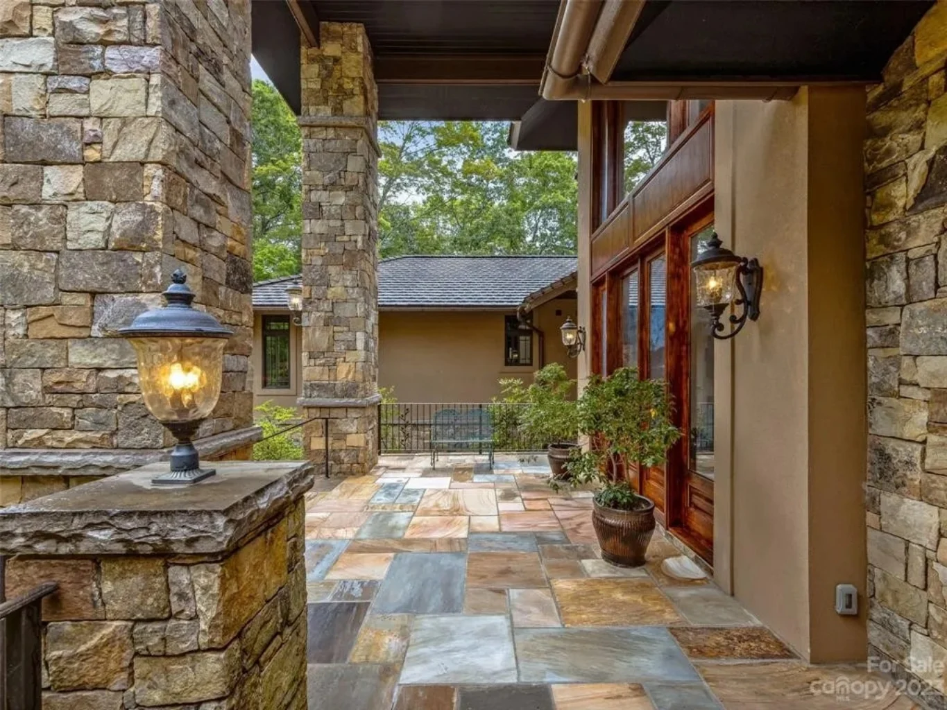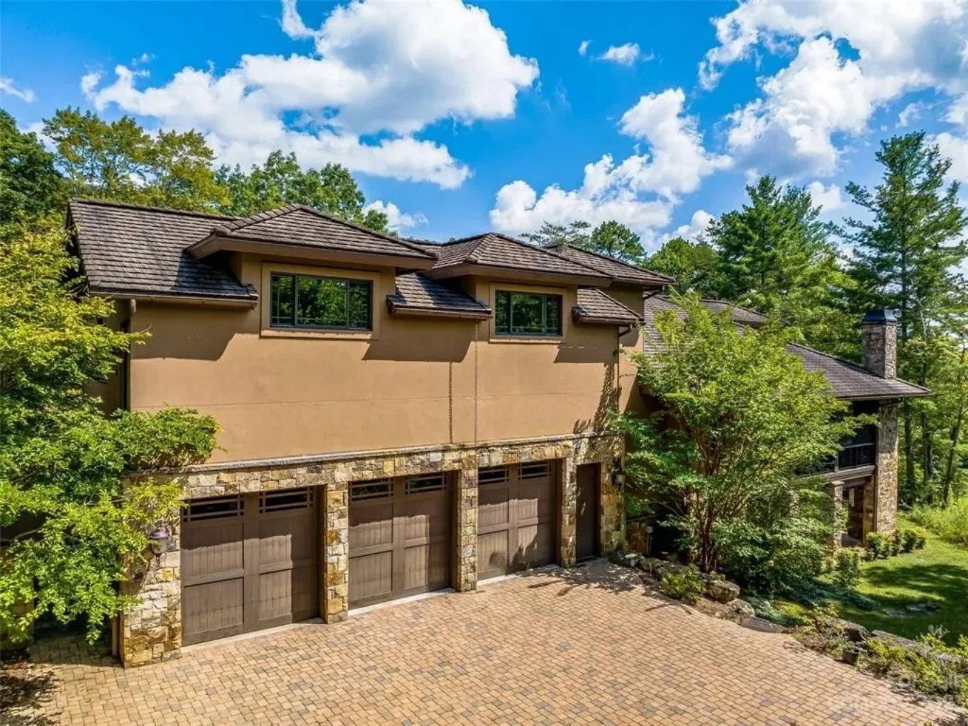 - Stone and timber accents create a timeless lodge-inspired exterior.