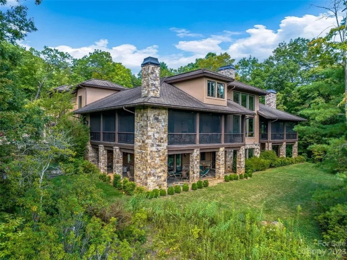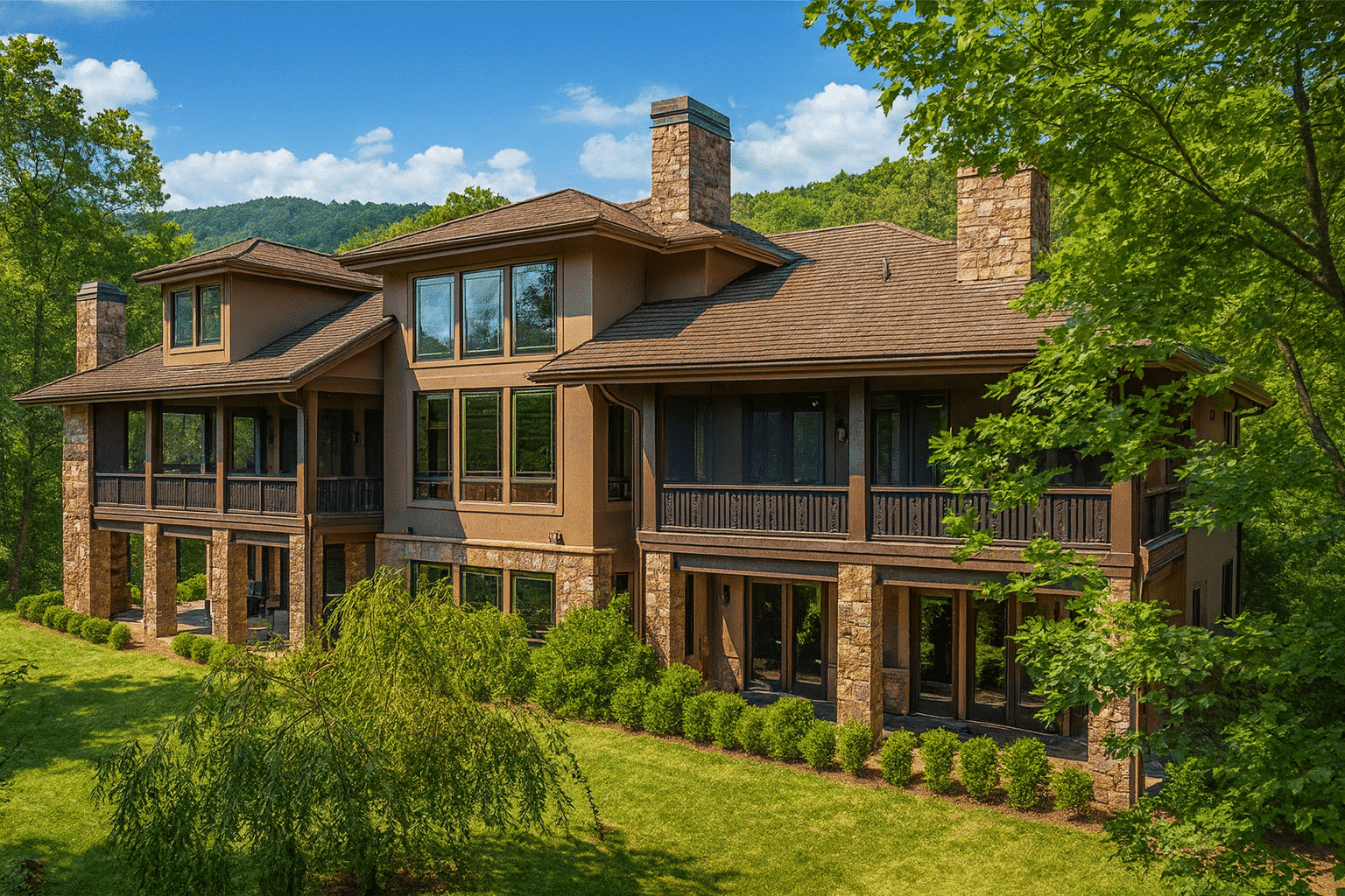 - Expansive decks and covered porches designed for mountain or lake views.