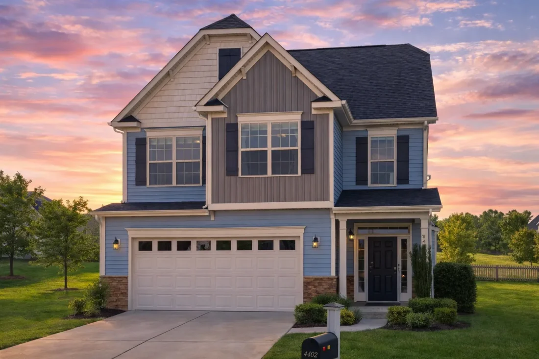 With its compact footprint, front-entry garage, and balanced proportions, this home fits comfortably into suburban developments or established neighborhoods. Its board and batten siding with stone detailing enhances curb appeal while maintaining a timeless look.