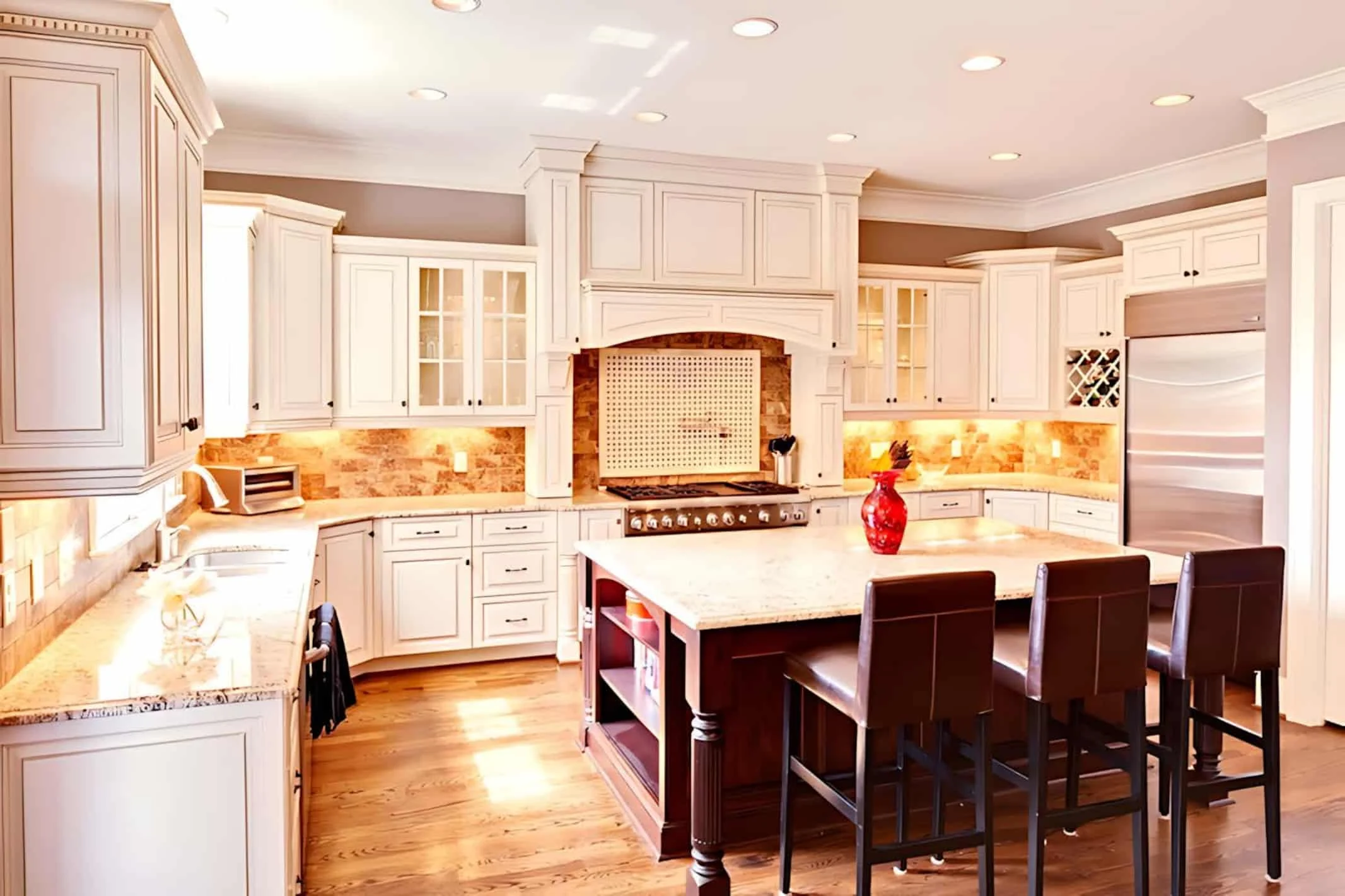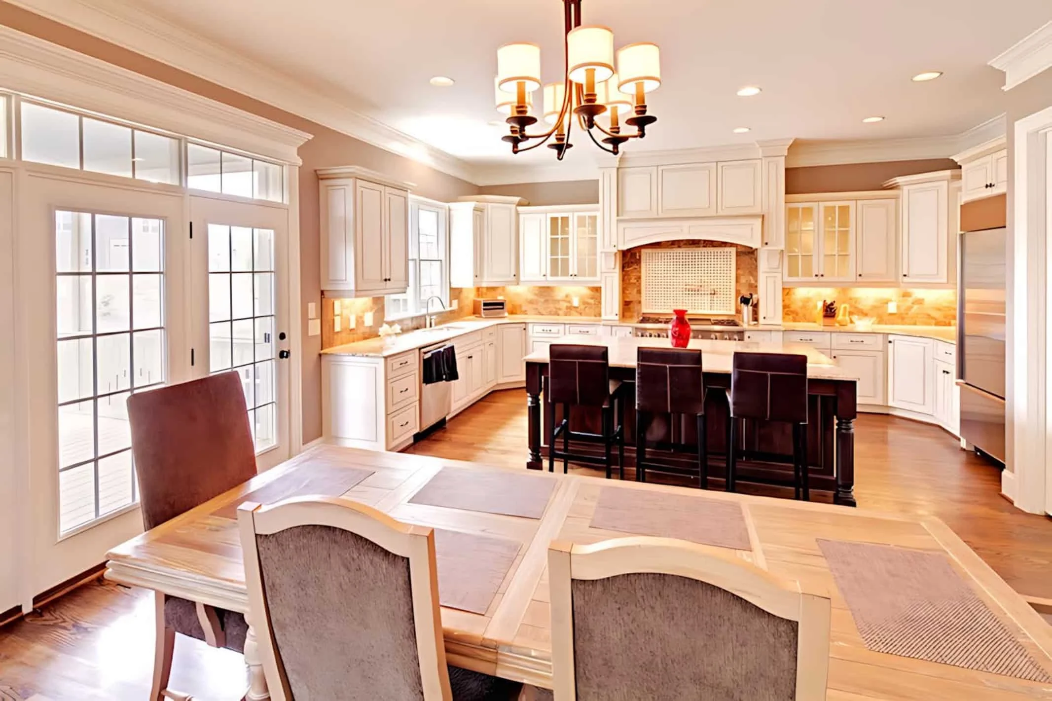 - - Kitchen work triangle keeps refrigerator, sink, and range within efficient reach while preserving prep space on the island.