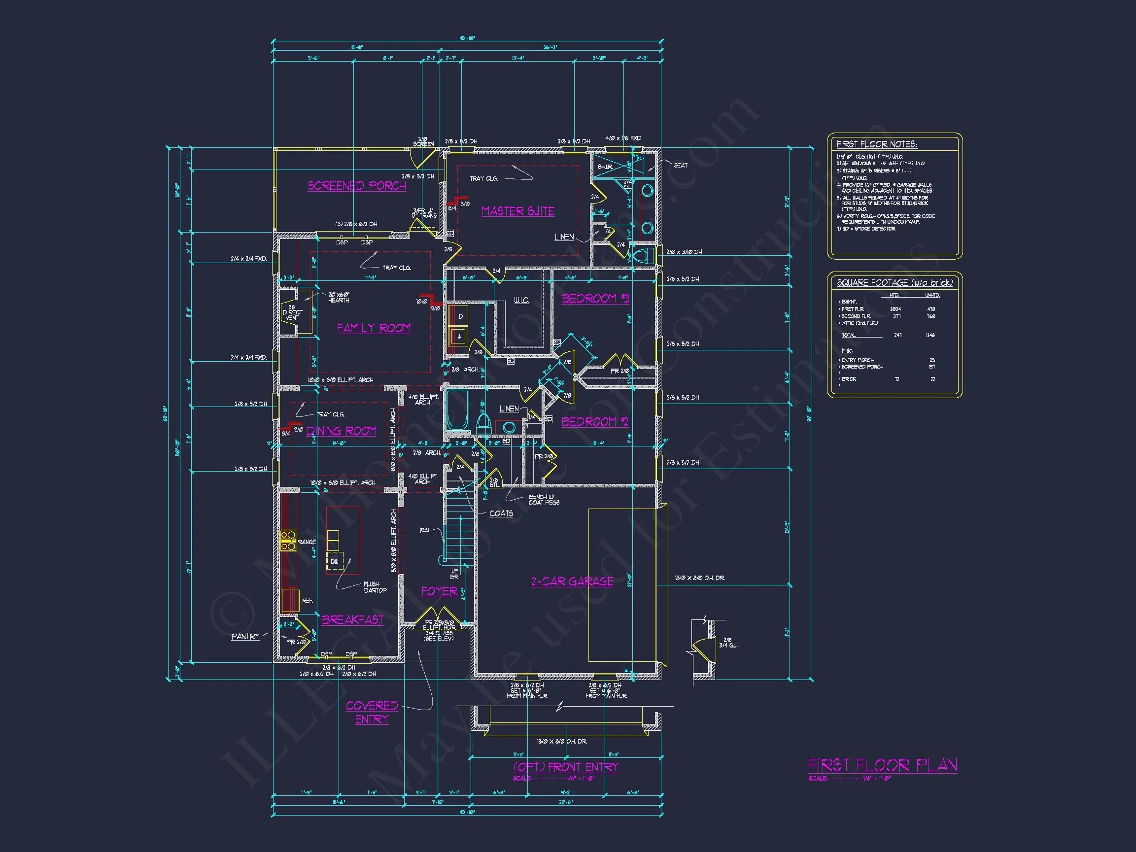 Explore this detailed 1.5-story CAD home plan with 3 bedrooms, 3 baths, a screened porch, and full basement—ideal for modern living and family functionality.