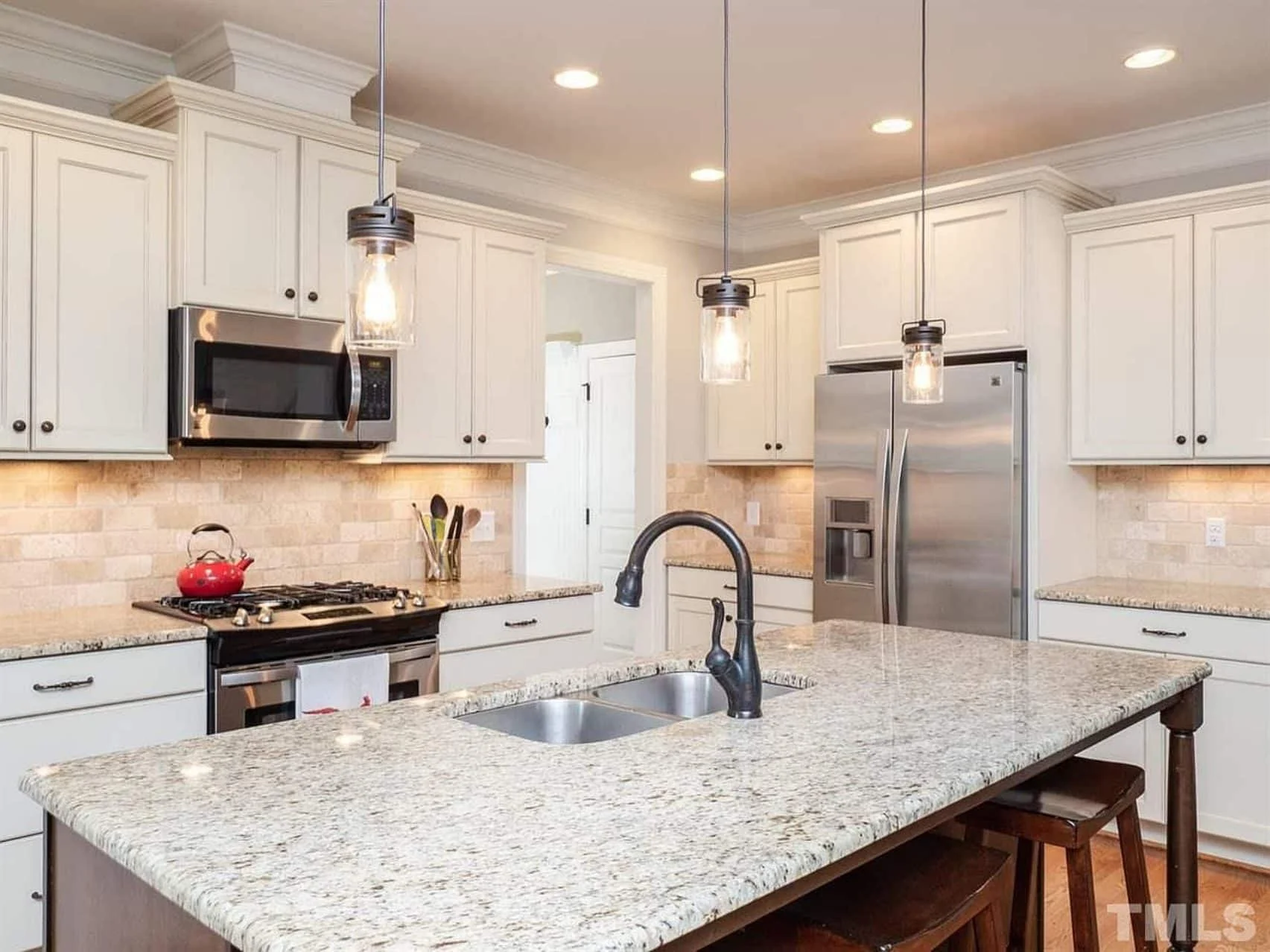 - Kitchen island, custom cabinetry, and both walk-in and butler’s pantries enhance functionality.