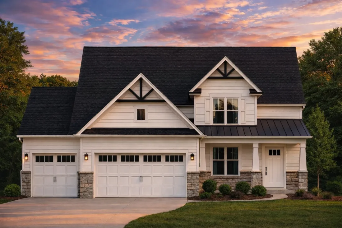 Explore this 2,800 sq. ft. New American home featuring a refined exterior mix, open living spaces, and timeless curb appeal.