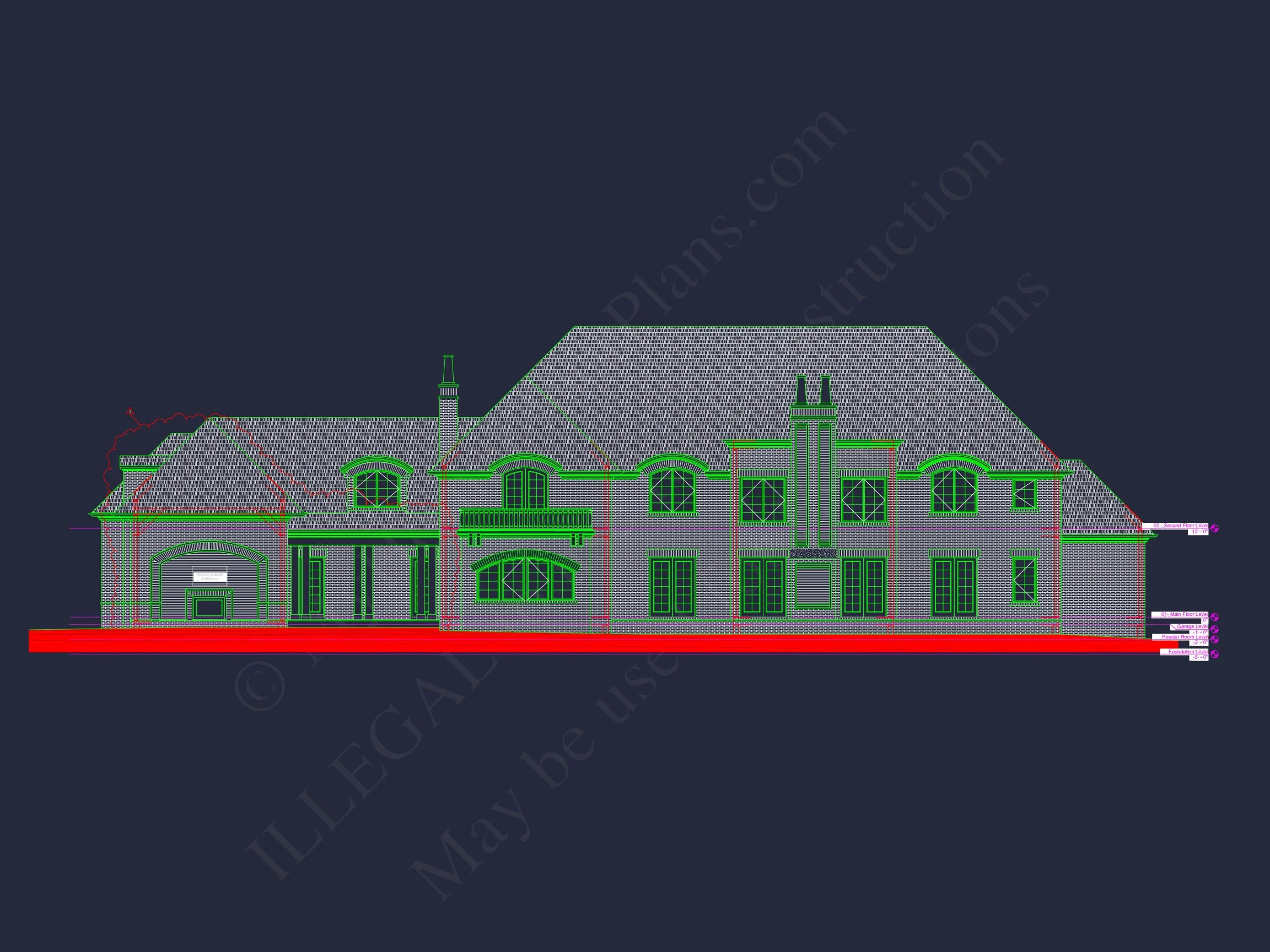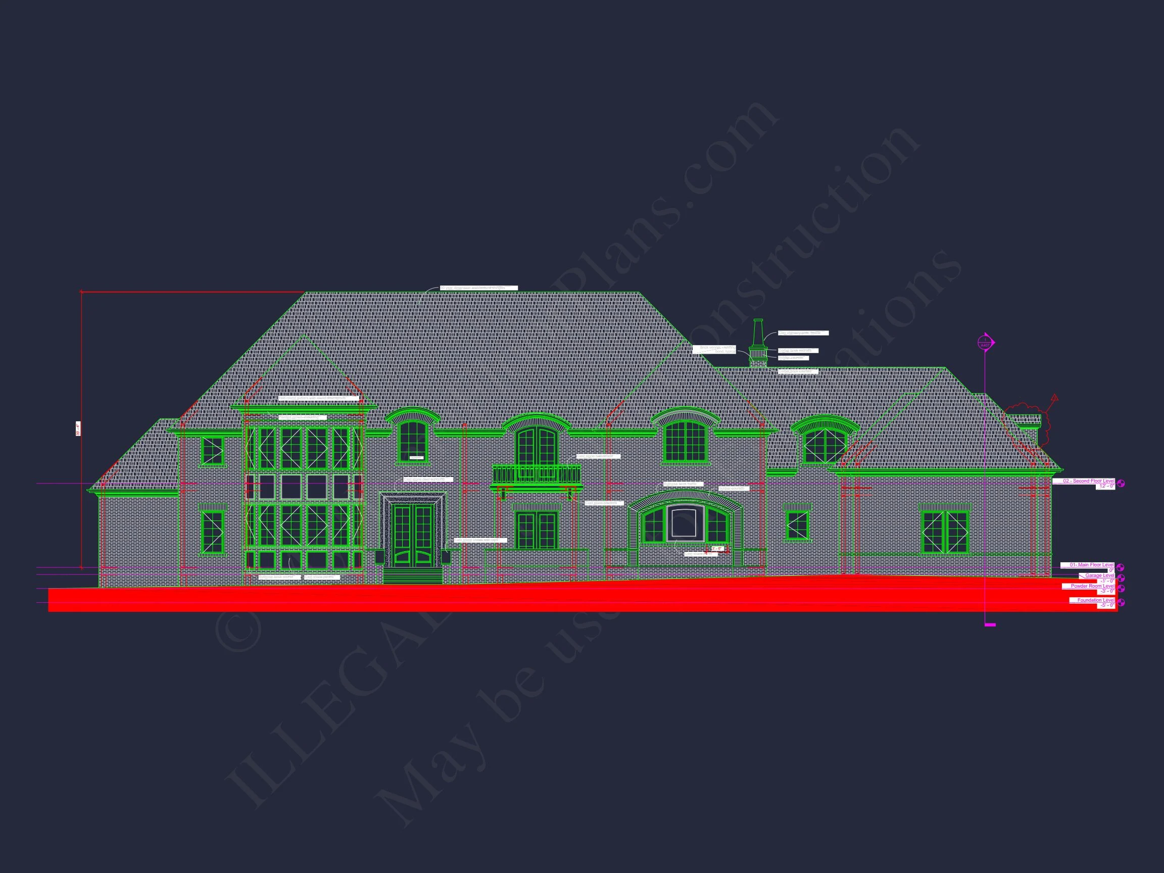 French Provincial and French Country house plan with brick exterior • 5 bed • 6 bath • 7,701 SF. Grand foyer, arched windows, elegant rooflines. Includes CAD+PDF + unlimited build license.