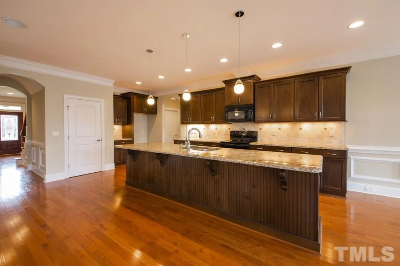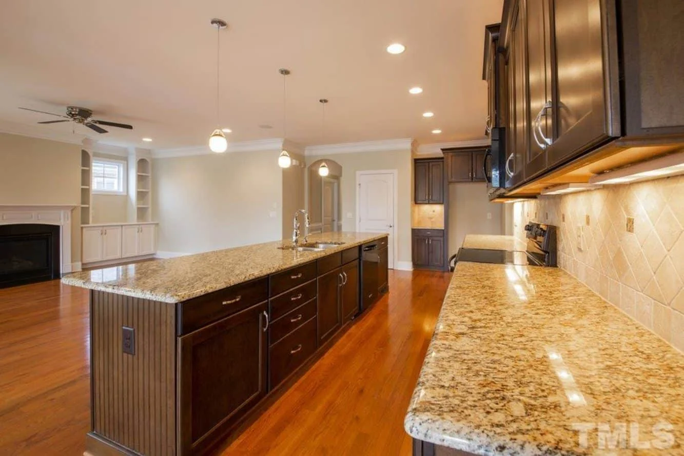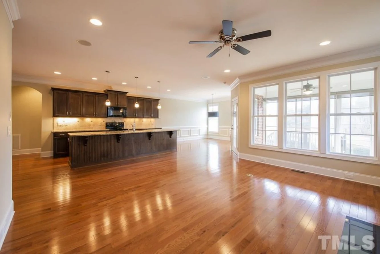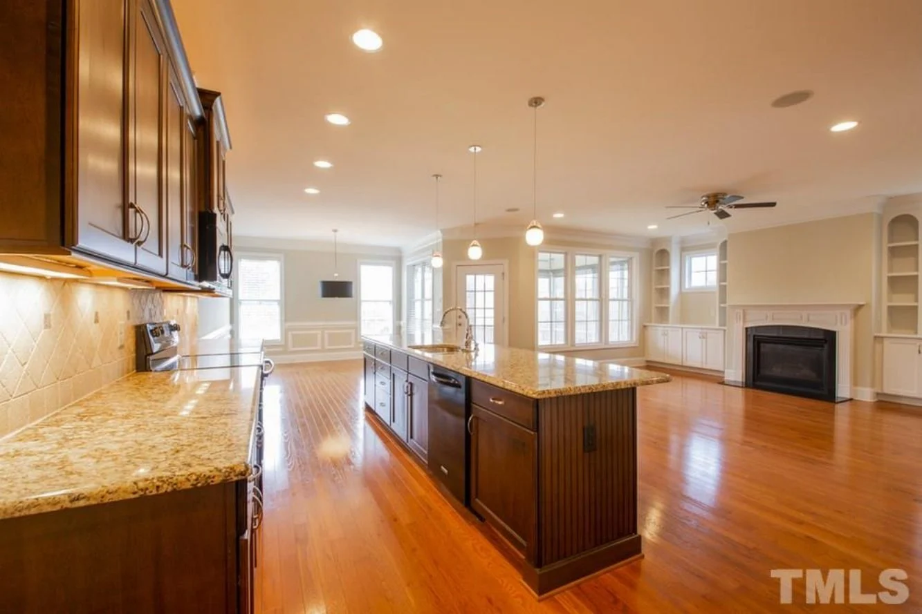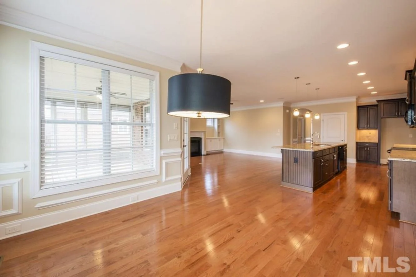 - Open concept layout connects the family room, dining area, and kitchen for an airy, inviting flow.