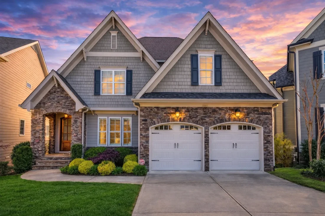 The exterior showcases a classic brick façade complemented by stone accents at the base and entry, grounding the home visually and structurally. Horizontal lap siding within the upper gables softens the massing and adds subtle Craftsman character. Architectural asphalt shingles complete the roofline, reinforcing durability and traditional styling.