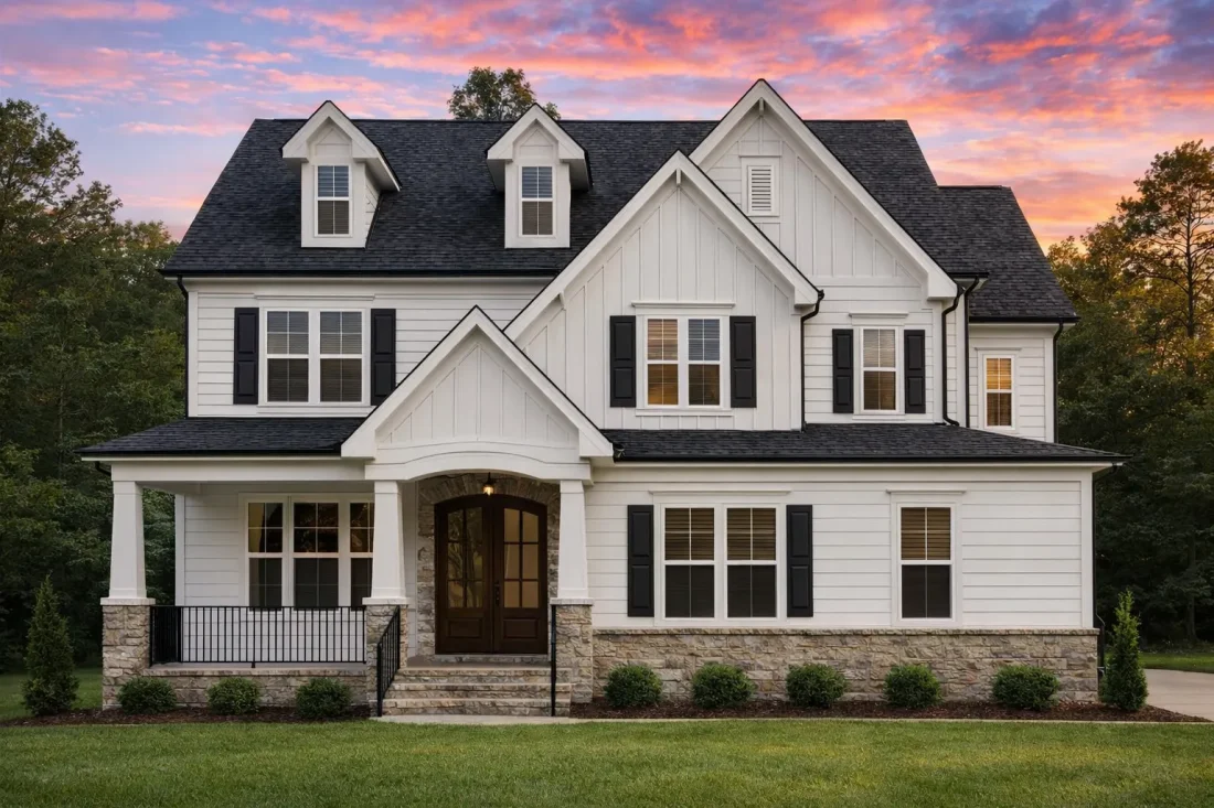 Rooted in New American architecture with strong farmhouse influences, this home showcases a harmonious mix of traditional detailing and updated design sensibilities. The exterior composition emphasizes symmetry, layered rooflines, and durable materials that enhance both curb appeal and resale value.