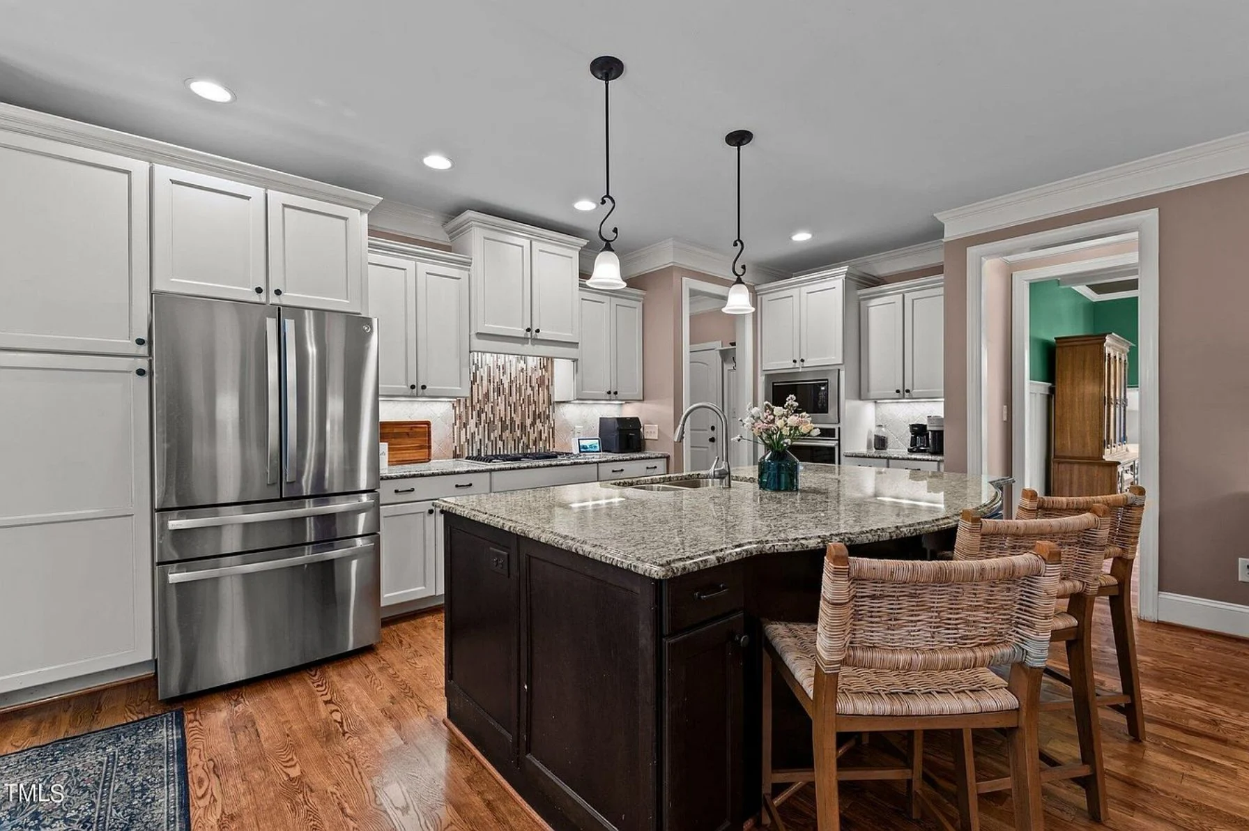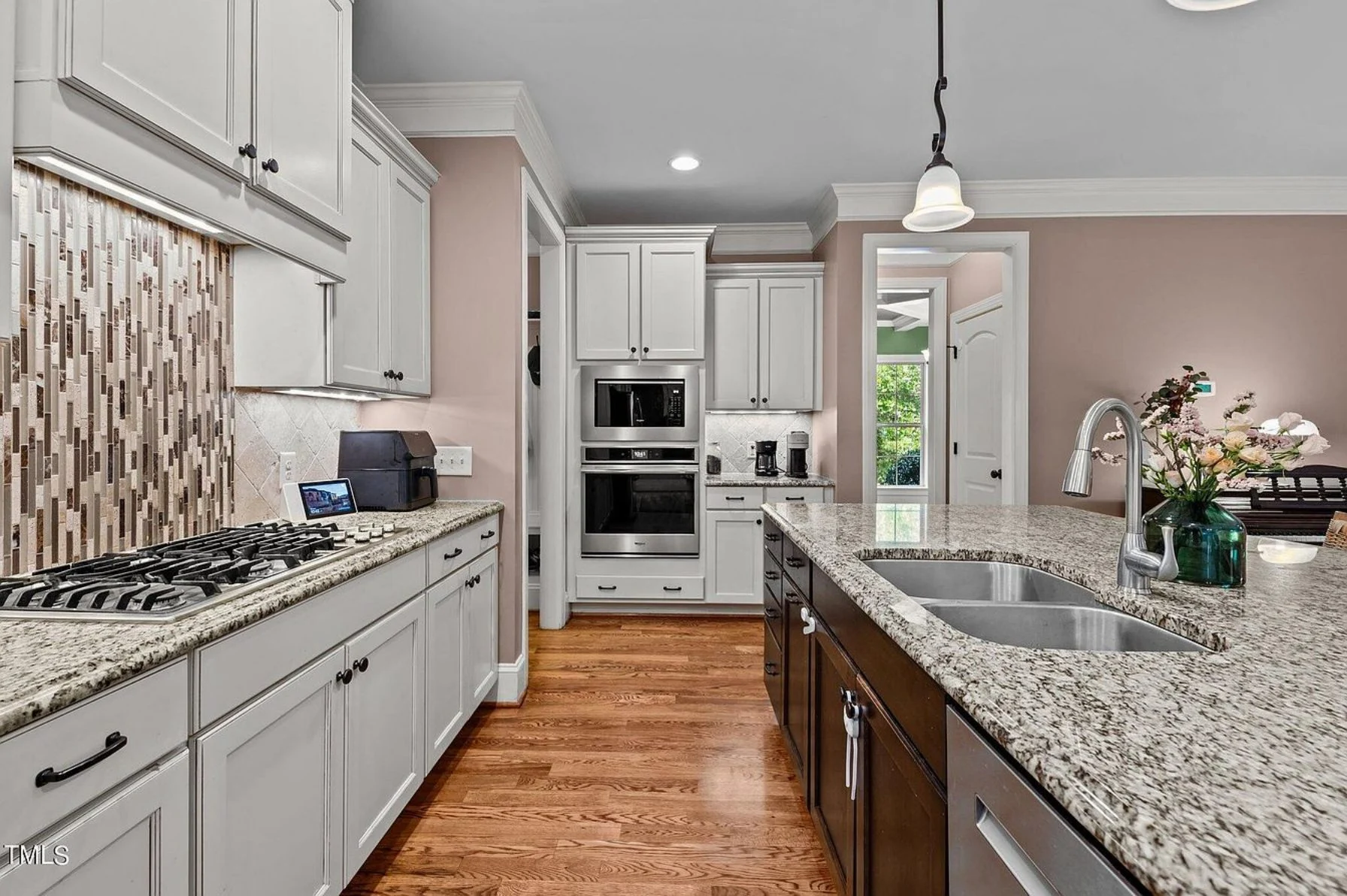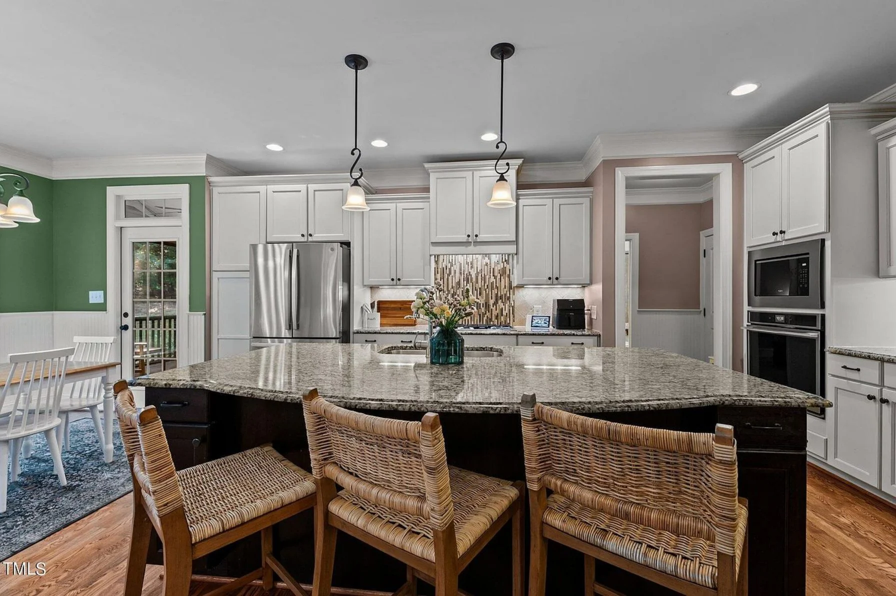 - Kitchen island and eating bar provide casual seating and prep space, complemented by a walk-in pantry.