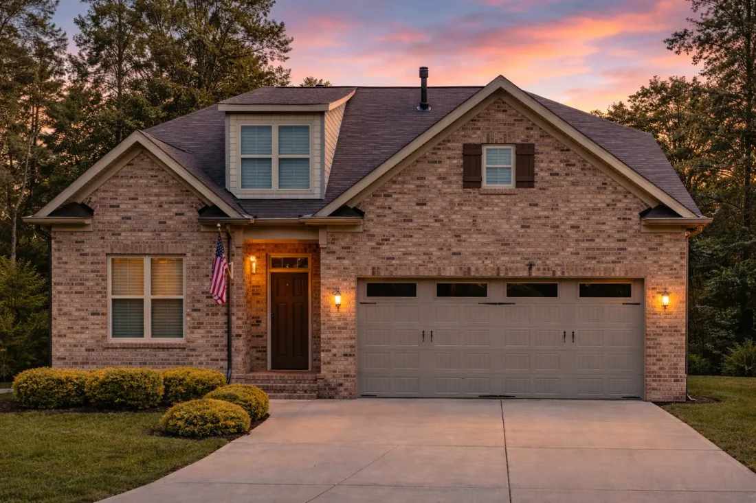 This home embraces Traditional and Tudor Revival influences, seen in its steep-pitched roof, brick siding, decorative half-timbering, and symmetrical front gables. The brick exterior offers both timeless style and durability. Subtle trim details, shutters, and window grids enhance curb appeal, creating a distinctive look reminiscent of English countryside cottages adapted for modern suburban life.