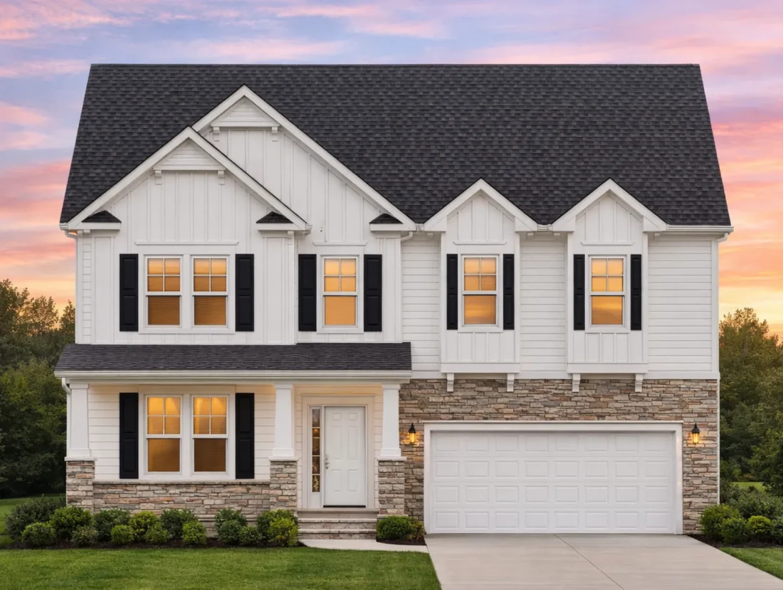 Defined by its welcoming façade, the exterior showcases board-and-batten siding, horizontal lap siding, and stone veneer accents. These materials work together to create a warm, upscale appearance that feels equally at home in established suburban neighborhoods or new residential communities.