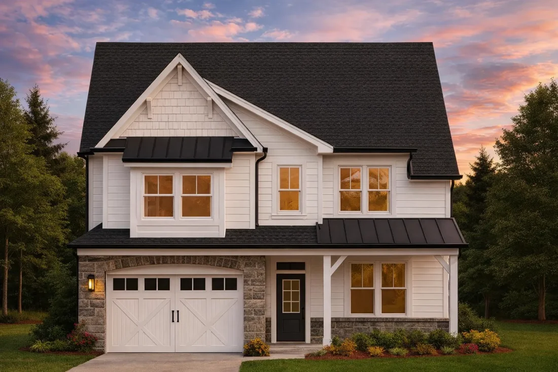 - Metal roof accents highlight key architectural sections such as dormers and window bays.