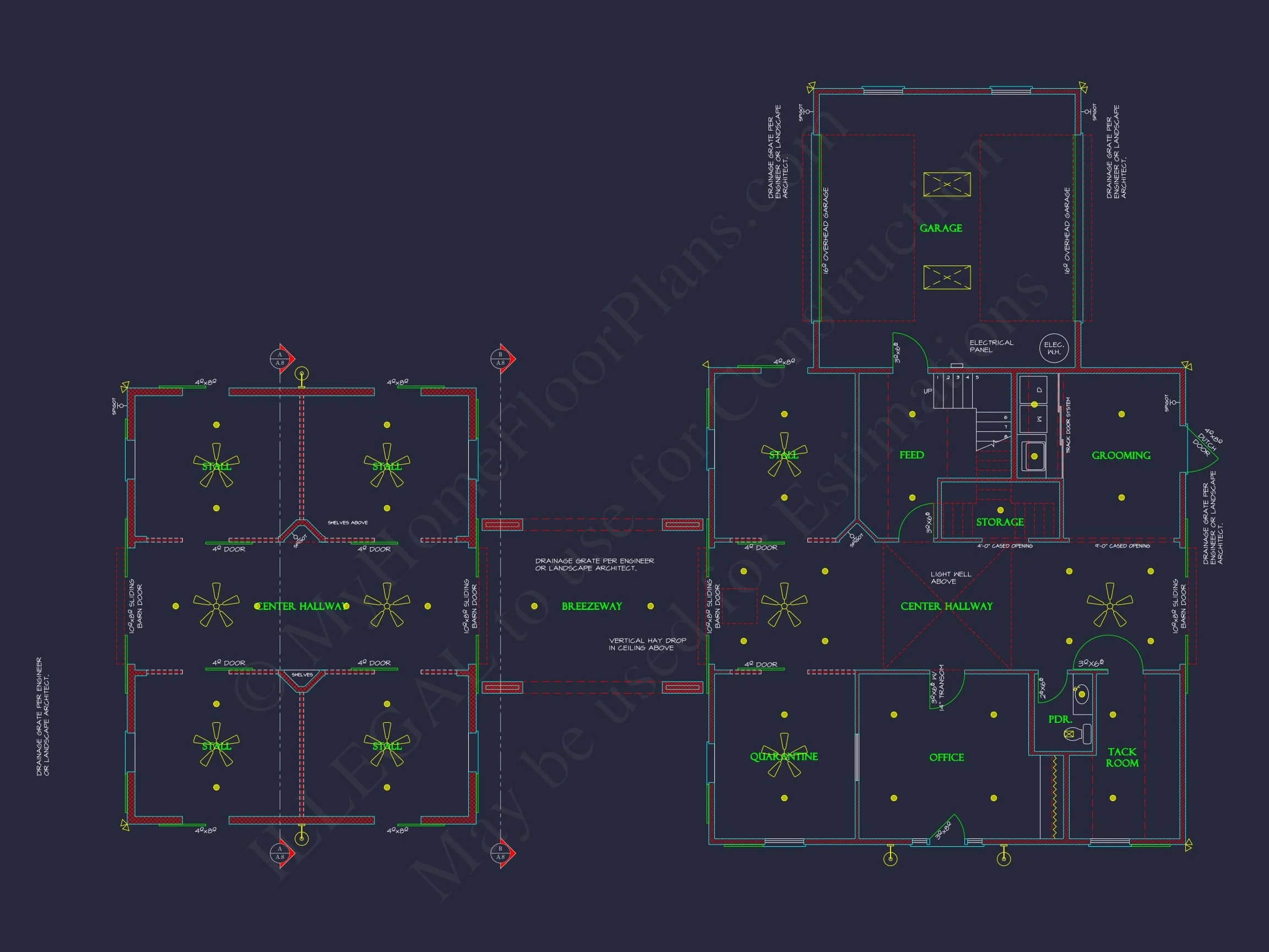 13-2070 HORSE STABLES – Horse Stable House Plan with 4-Bay Garage | Blueprint Designs