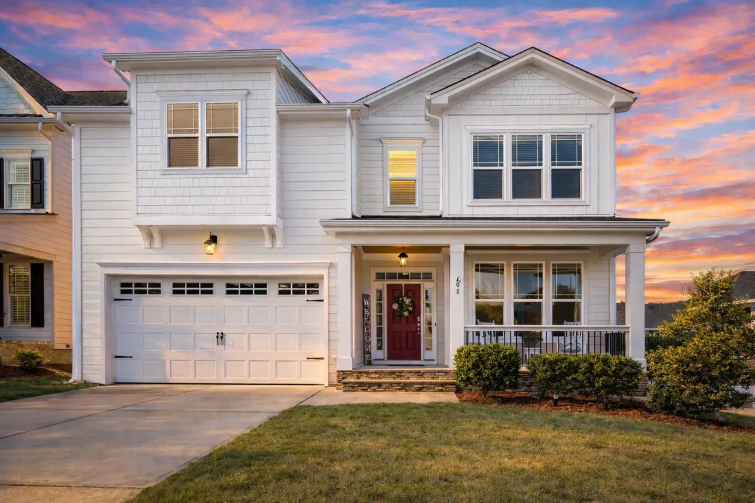 The front porch creates depth and dimension while offering functional shelter. The gabled rooflines introduce vertical articulation, preventing the two-story mass from feeling boxy.