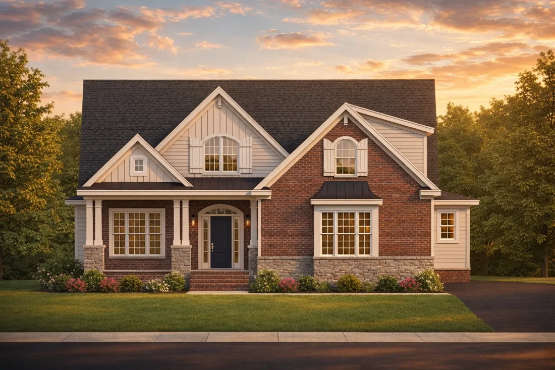 The exterior showcases a harmonious mix of brick, stone, board and batten, and horizontal siding—materials commonly associated with Modern Traditional and Craftsman-influenced homes. Together, they create depth, texture, and enduring appeal that will age gracefully across decades of ownership.