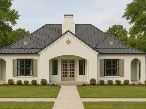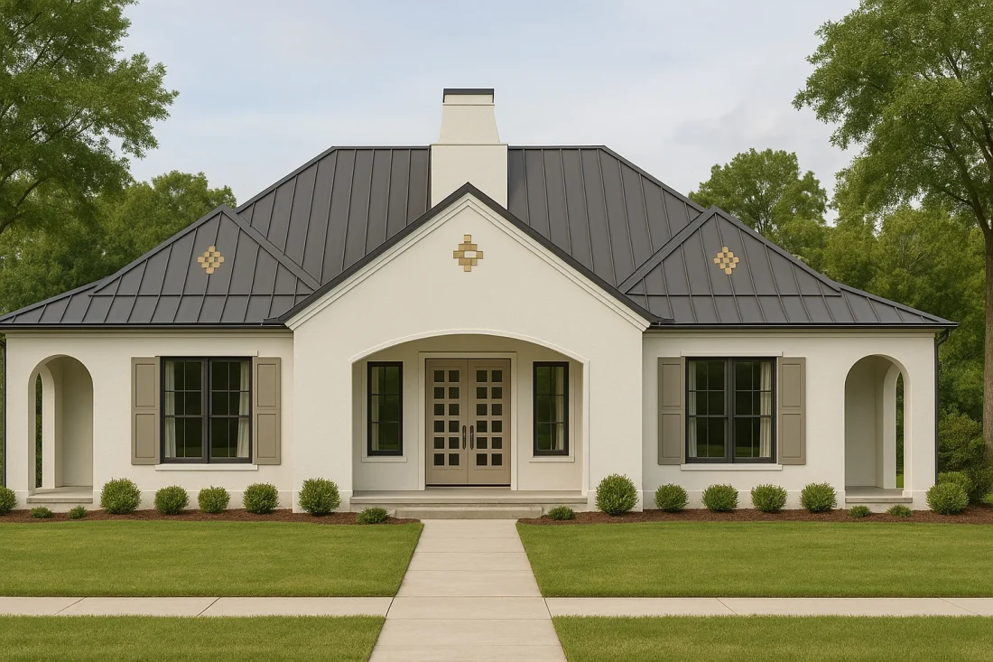 - – Modern French Country Design with Stucco and Metal Roof