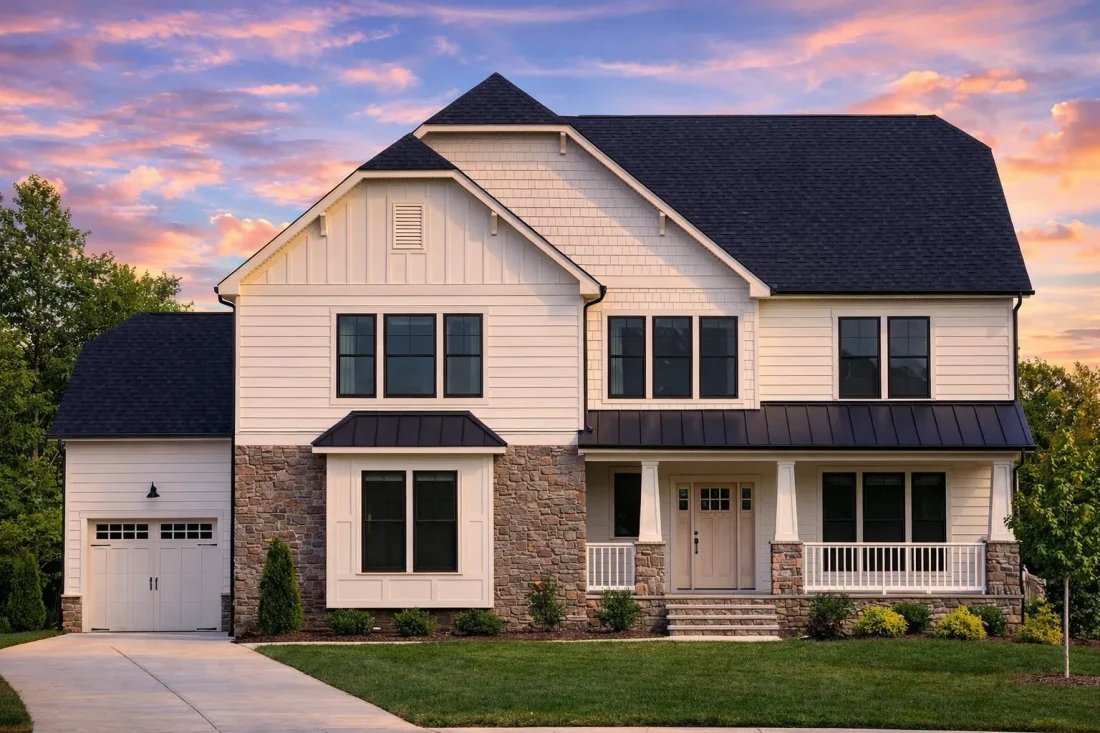 The combination of siding and stone creates dimension and depth while maintaining timeless appeal. This New American exterior works beautifully in suburban neighborhoods, wooded lots, or semi-rural settings.