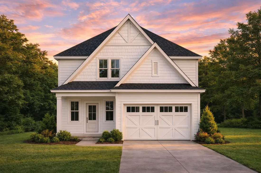 - Wood-tone garage doors and trim add warmth and authentic craftsman texture.