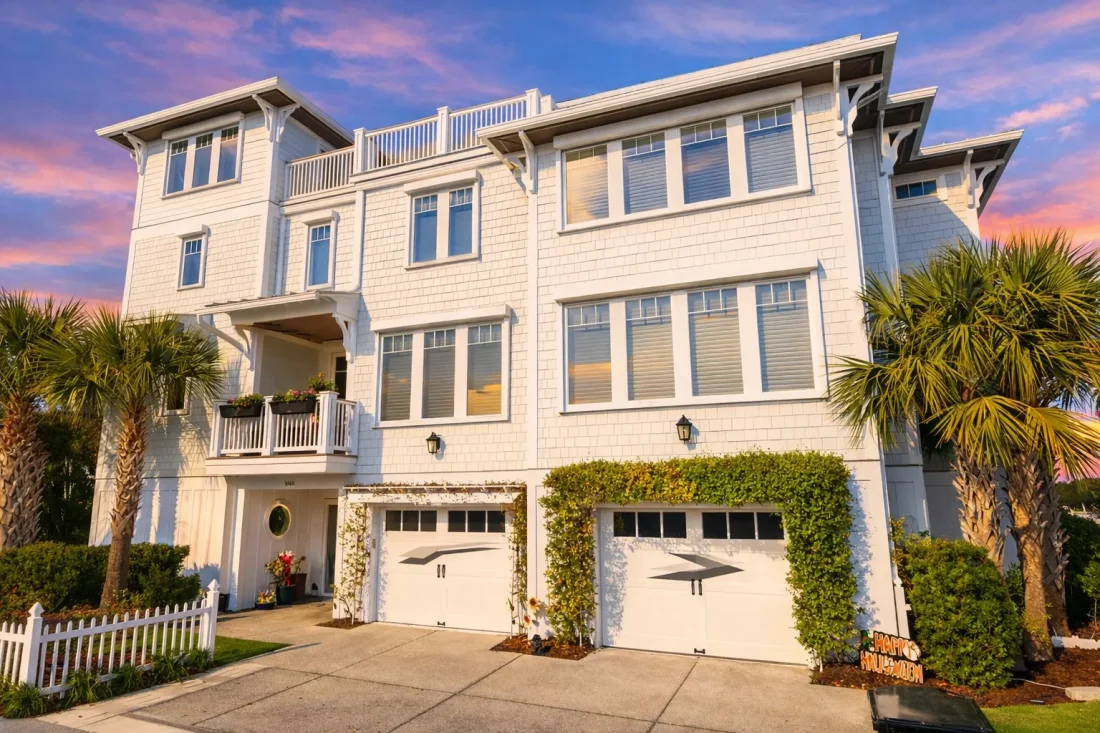 The raised garage design not only meets coastal code requirements but also preserves the architectural symmetry of the façade.