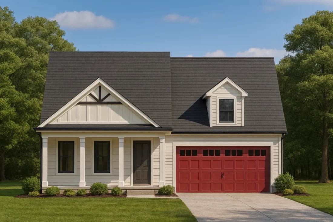 - Classic front-facing gables with simple farmhouse detailing