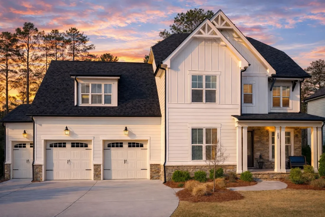 Rooted in New American architecture with subtle Craftsman influences, this home emphasizes clean rooflines, balanced window placement, and high-quality exterior materials. Vertical board-and-batten siding pairs beautifully with horizontal lap siding and stone accents, creating depth, texture, and strong curb appeal without feeling overly ornate.
