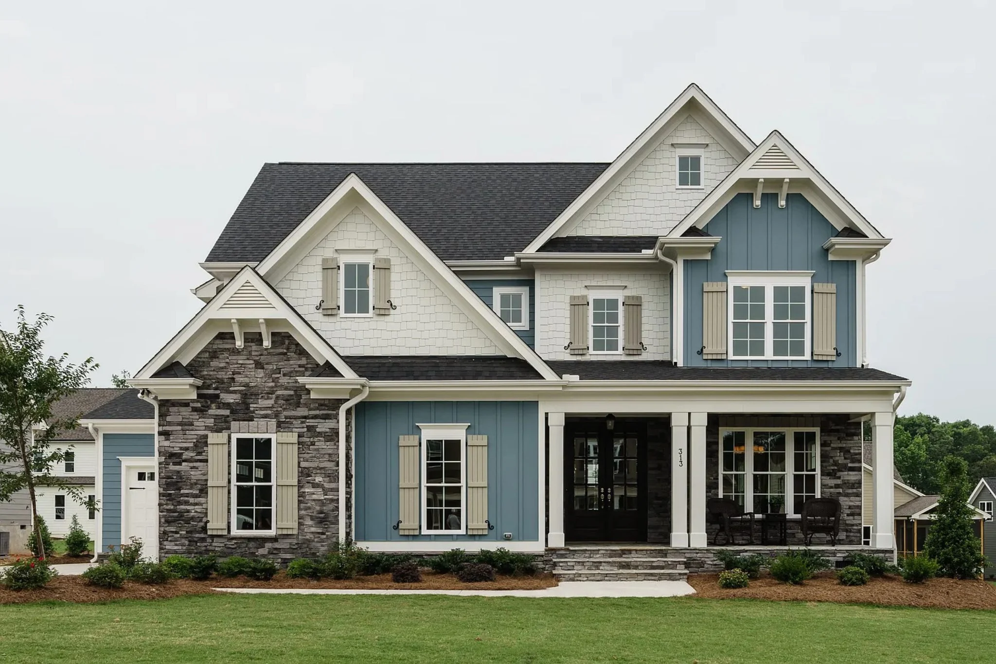 - Board and batten siding with stone accents for that signature Craftsman curb appeal.