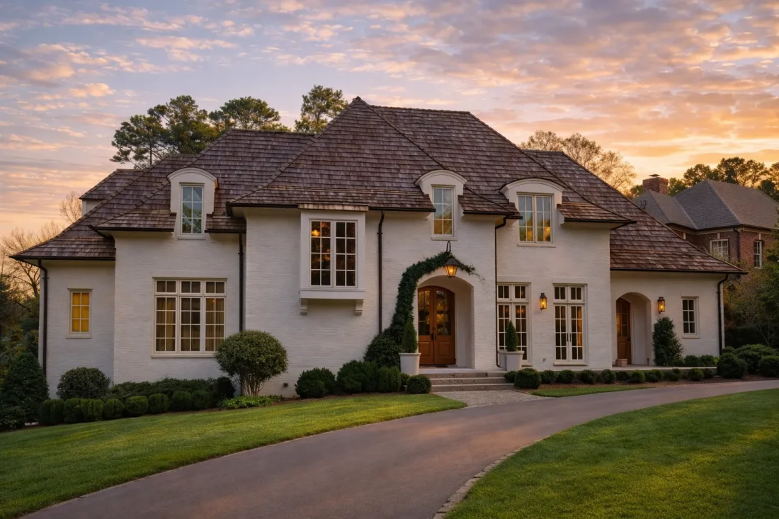 The exterior reflects authentic French Provincial architecture, a style rooted in the countryside estates of France and adapted for modern American construction. The smooth stucco exterior provides a clean, upscale appearance that highlights the home’s sculpted forms and elegant roof geometry.