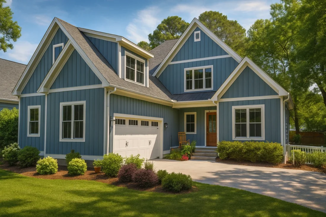 - Board & batten siding and shingle accents create a warm exterior aesthetic.