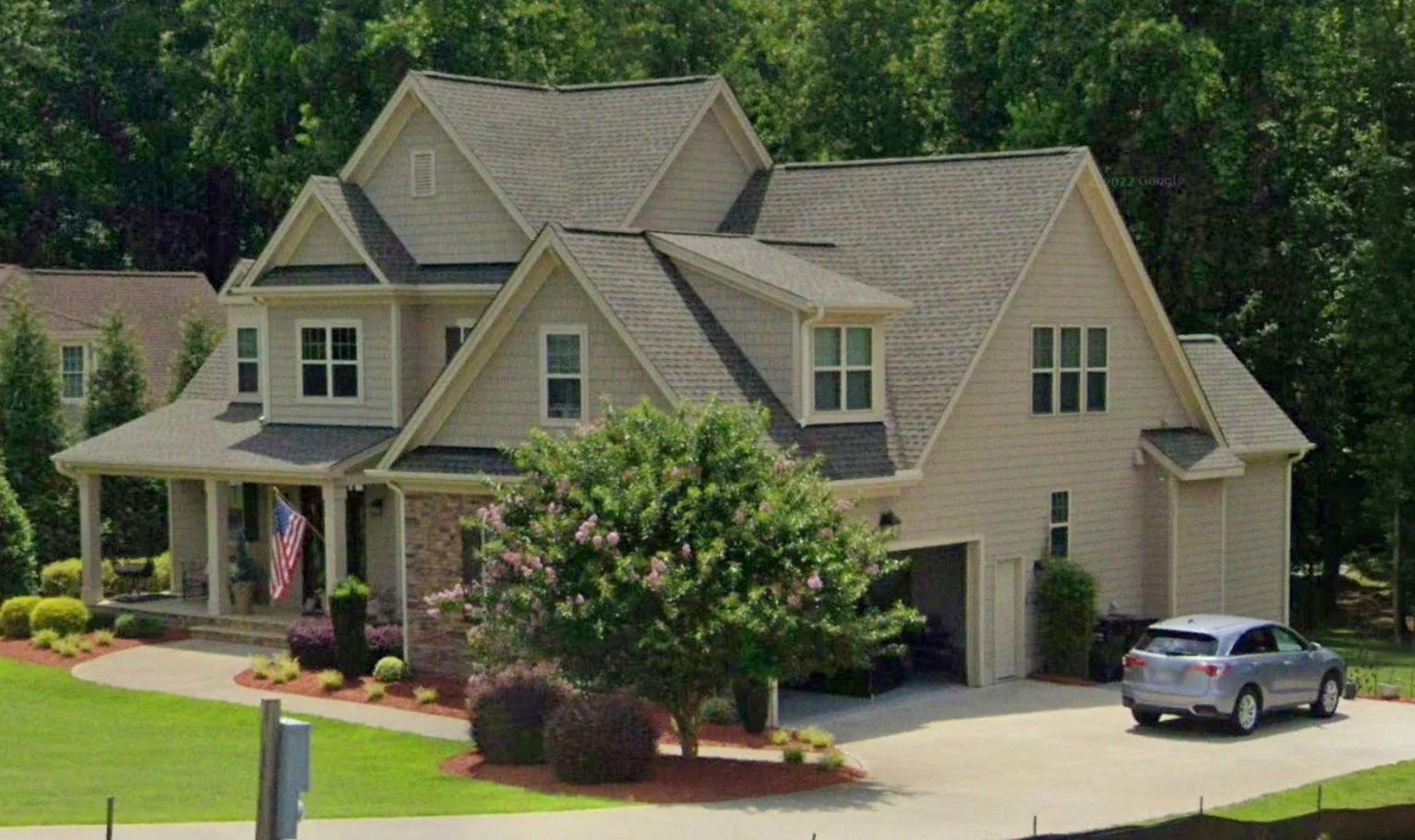 - Covered front porch framed with shake siding and stone accents for timeless charm.