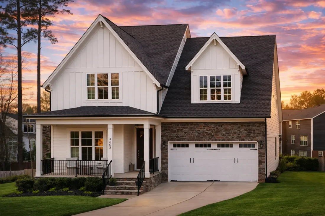 The exterior architecture showcases hallmark modern farmhouse elements: vertical board and batten siding, steeply pitched gables, simple trim profiles, and a welcoming front porch presence. These features combine to create a home that feels grounded, elegant, and approachable. Black-framed windows and warm exterior lighting add contrast and sophistication without overpowering the classic farmhouse character.
