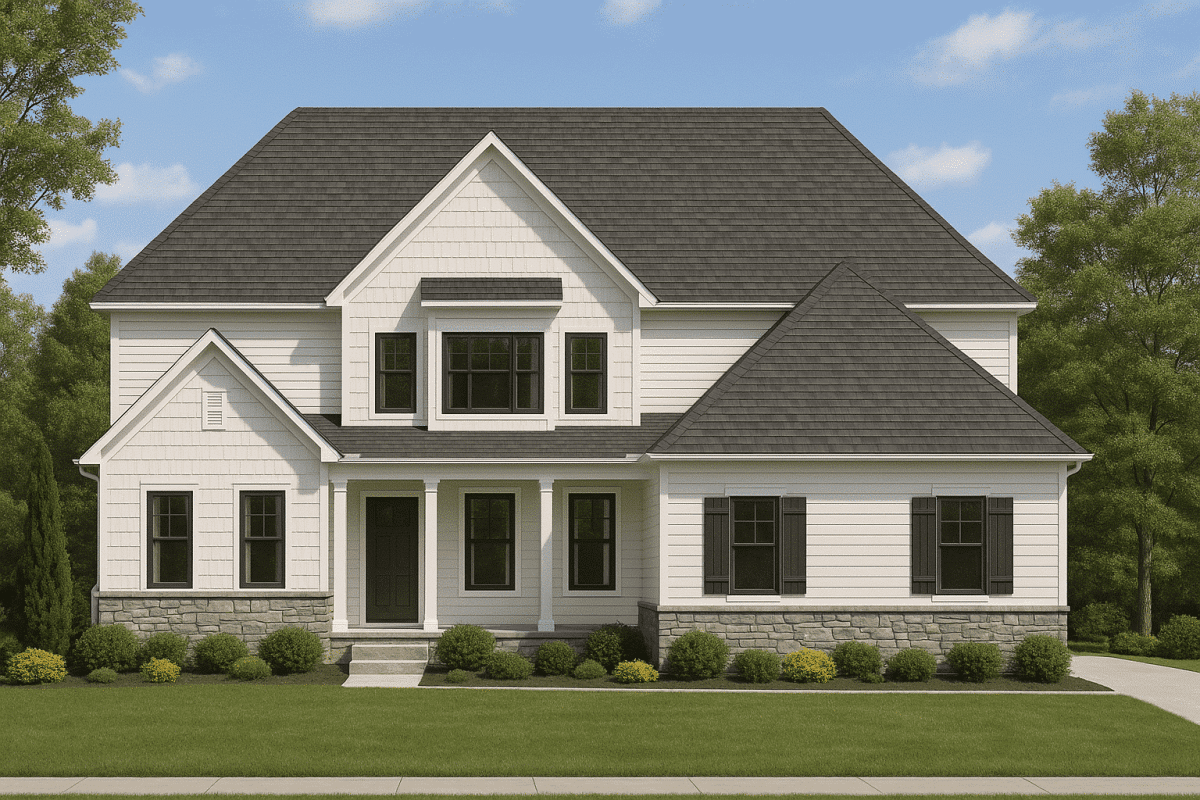 - Exterior showcases stone, shake, and siding finishes.
