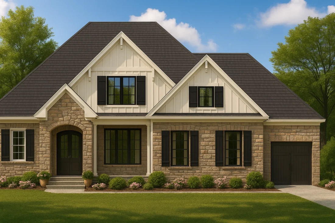The New American style has emerged as one of the most popular residential architectural movements in the United States, combining the familiarity of traditional forms with simplified detailing and contemporary proportions. This home showcases hallmark characteristics such as steep gabled rooflines, black-framed windows, and a harmonious blend of stone and horizontal siding.