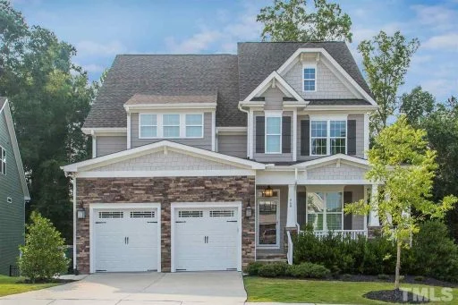 - Exterior showcases a mix of stone veneer, shake siding, and lap siding for transitional appeal.