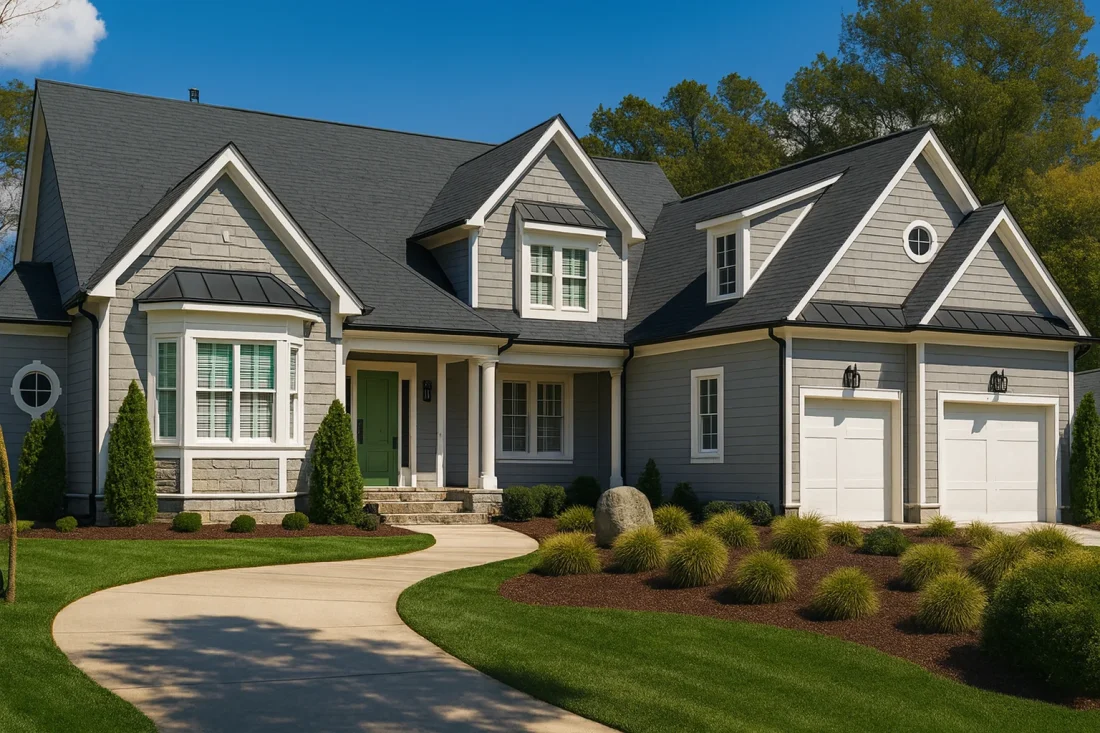 - Exterior finishes include a beautiful mix of shakes, stone, and traditional siding.