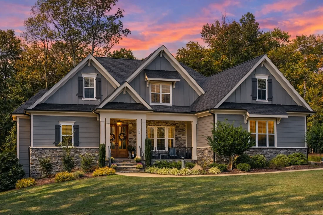 - Multiple front-facing gables that create architectural depth