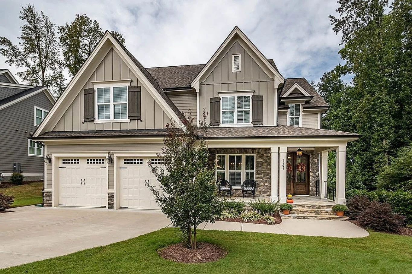 - Board & batten, brick, and stone exterior accents create classic suburban appeal.