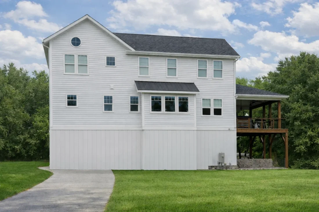- Board & Batten siding paired with horizontal lap and a metal roof create timeless curb appeal.