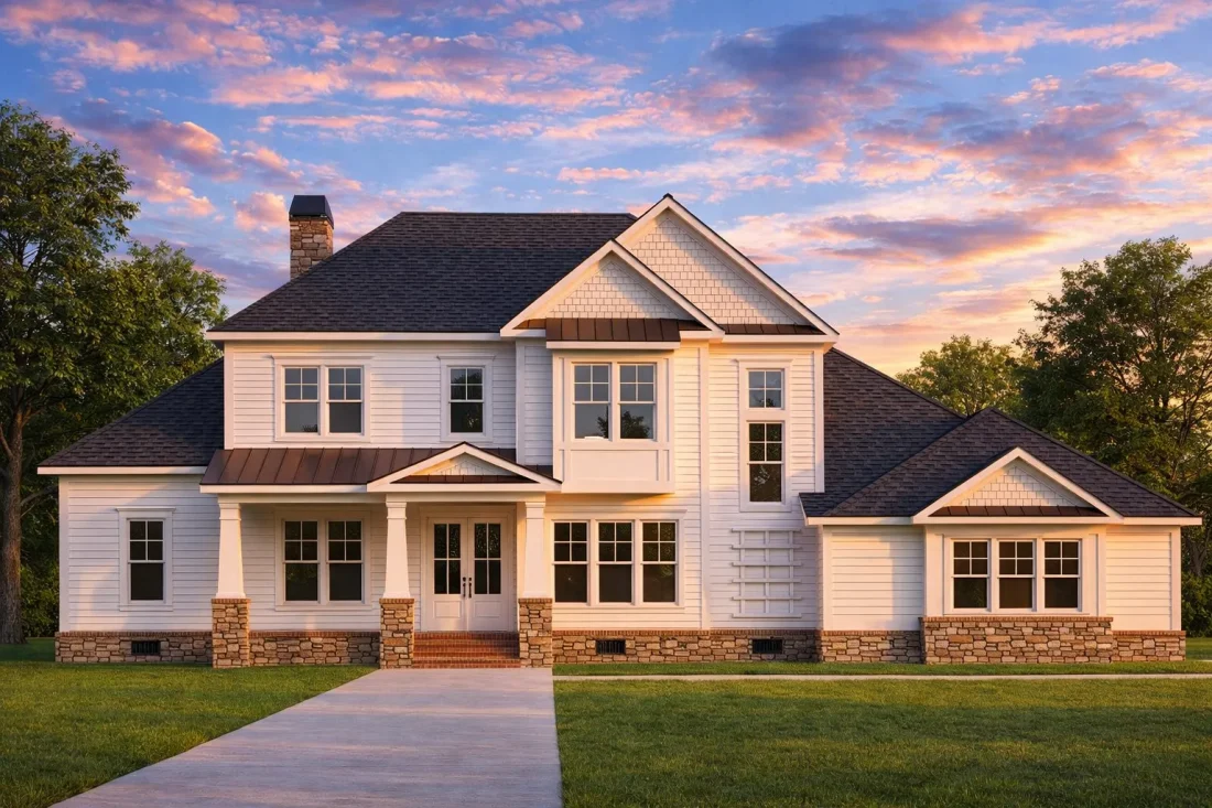 - Gabled rooflines with traditional proportions