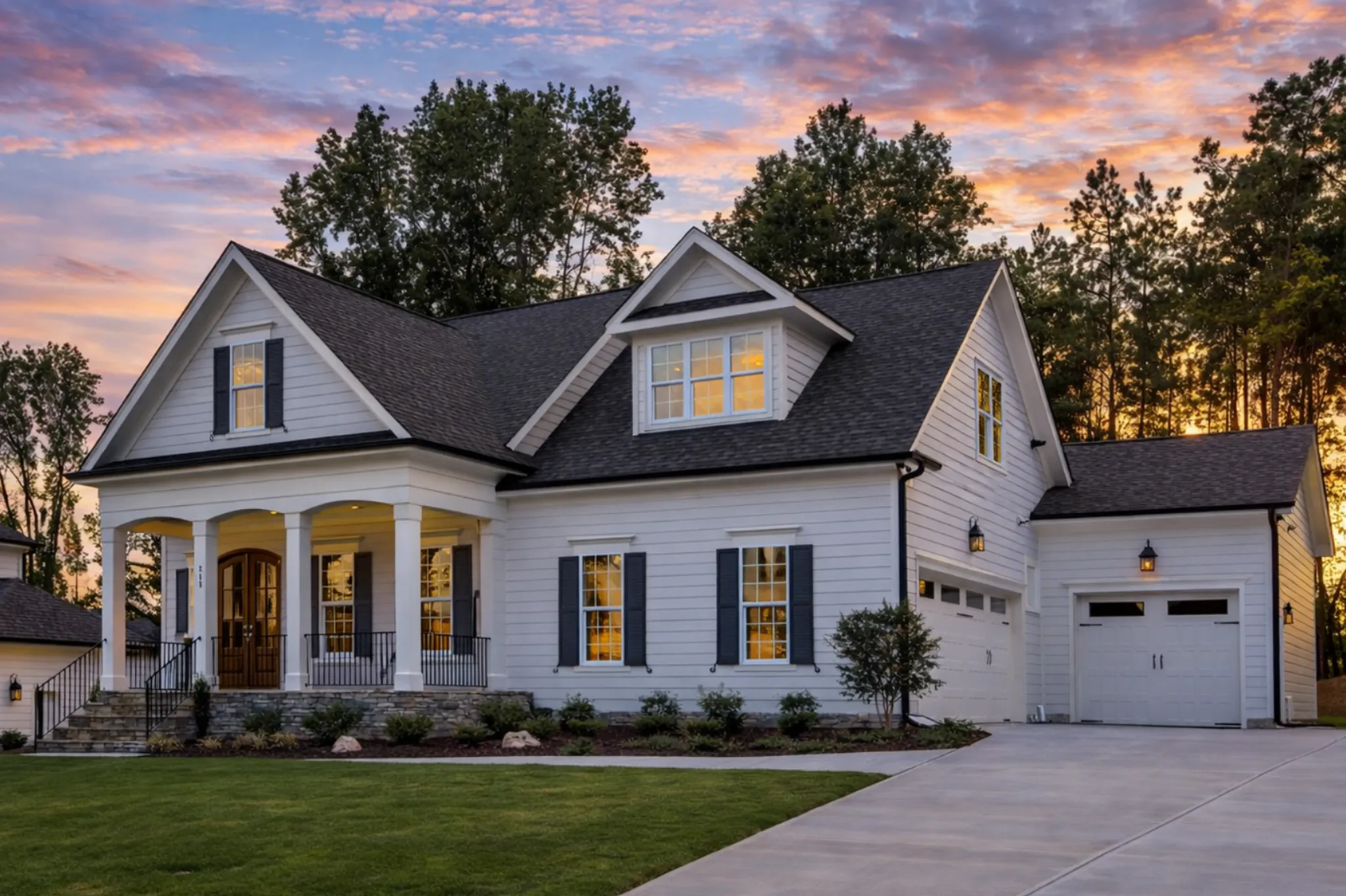 - Covered front porch with classic proportions