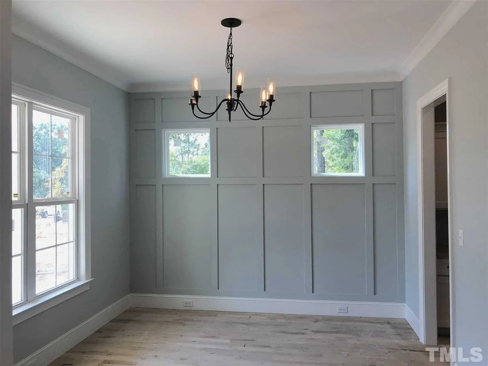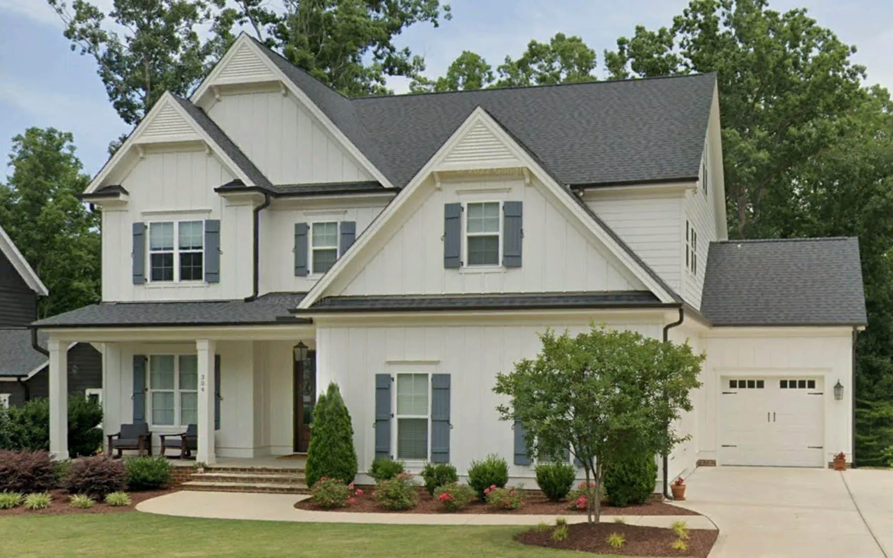 - Board & batten siding enhances the home’s farmhouse aesthetic.
