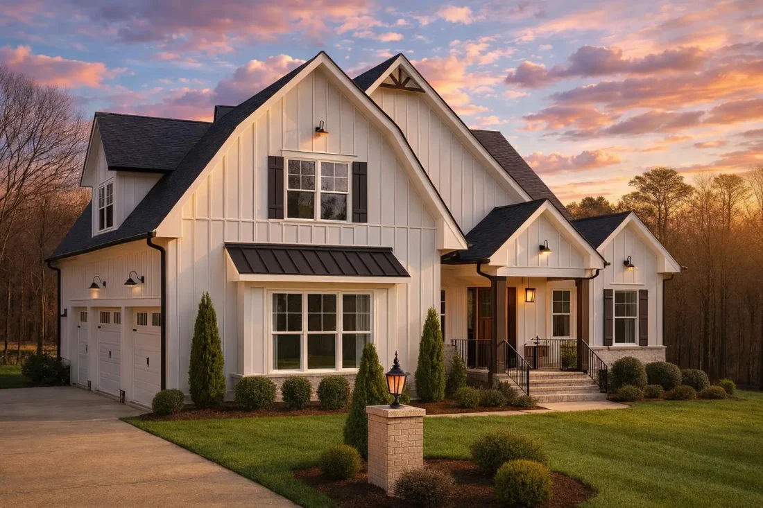 With crisp board-and-batten siding, steep gables, metal roof accents, and striking black trim, this design perfectly captures the Modern Farmhouse aesthetic. It’s an ideal blend of rustic character and contemporary elegance.