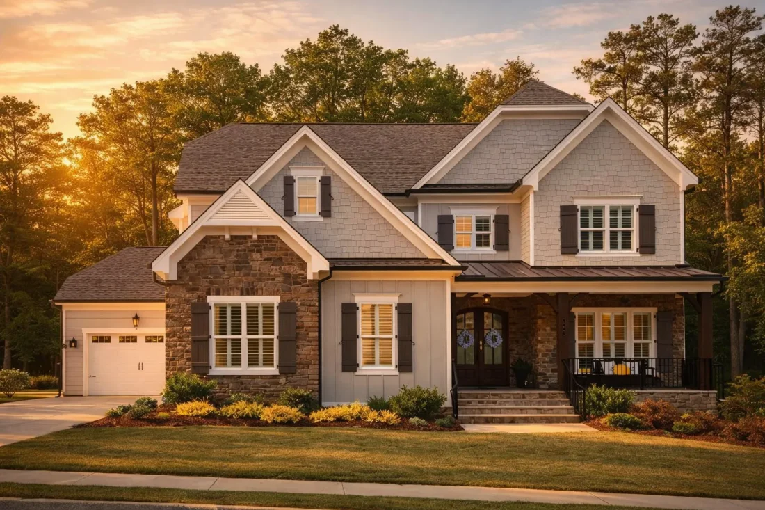 Rooted in the popular New American (Modern Traditional) style, this home features a welcoming façade defined by layered gables, strong rooflines, and a refined mix of materials. The exterior showcases horizontal lap siding paired with stone veneer accents, creating visual depth and upscale curb appeal while remaining approachable and timeless.