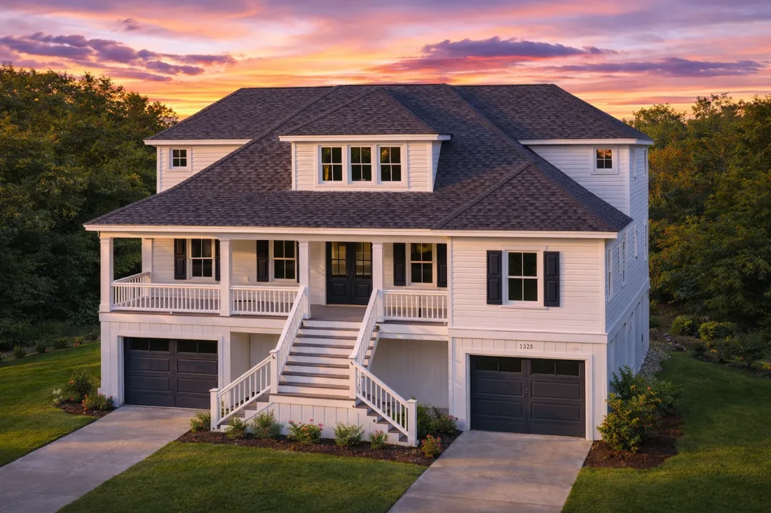 - Coastal Traditional design: Elevated entry, deep porches, light siding, and relaxed outdoor living.