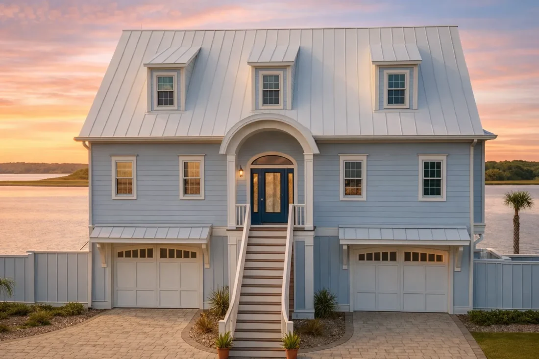 This home draws from traditional Low Country architecture, a style rooted in the American Southeast and adapted for humid climates, coastal winds, and flood-prone regions. Hallmark features include raised construction, deep roof overhangs, tall windows, and breezy circulation patterns.