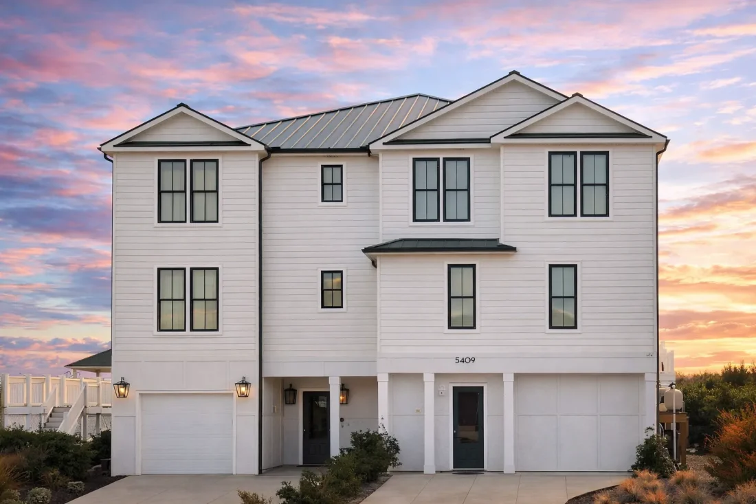 - Dual garage bays provide space for vehicles, storage, or coastal gear