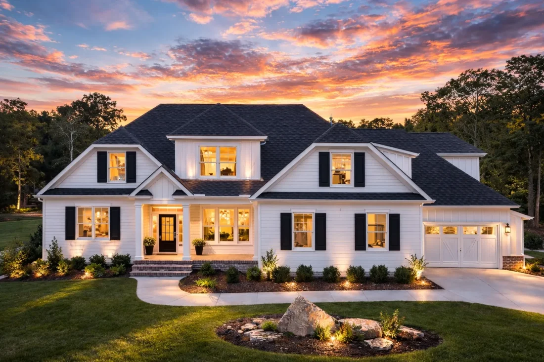 New American homes are known for blending classic architectural principles with modern functionality. This design introduces Transitional Farmhouse elements such as simplified detailing, welcoming porch design, and practical layouts—creating a home that feels current without sacrificing long-term appeal.