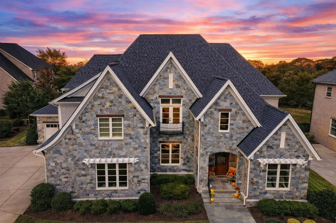 The curb appeal of this home is unmistakable. A richly textured stone exterior provides durability, prestige, and visual depth, while multiple front-facing gables create a dynamic roofline with strong European influence. Tall windows with traditional proportions allow natural light to flood the interior while maintaining architectural symmetry.