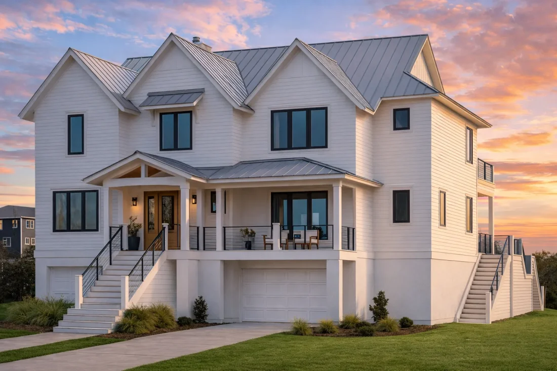 This home is designed with coastal performance in mind. Elevated construction, durable exterior materials, and smart roof design help protect against moisture, wind, and harsh weather conditions. These principles align with best practices seen in coastal residential architecture, as documented by Fine Homebuilding.